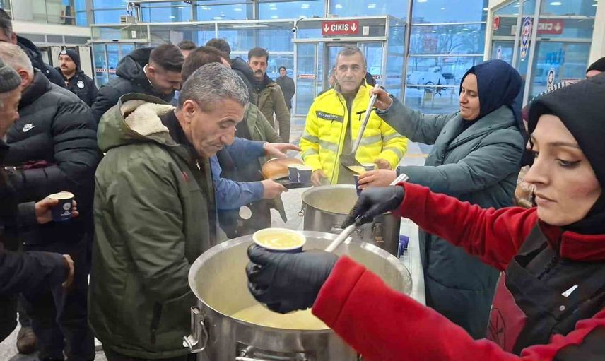 Karla mücadele sürerken terminalde yolculara sıcak çorba ikramı yapıldı