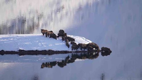 Sivas’ta yaban hayatı fotoğrafçısı Mustafa Aslan, sıfırın altında 20 derecede yaklaşık 40 domuzun tek sıra halinde suya girip karşı kıyıya geçtiği anları görüntüledi.