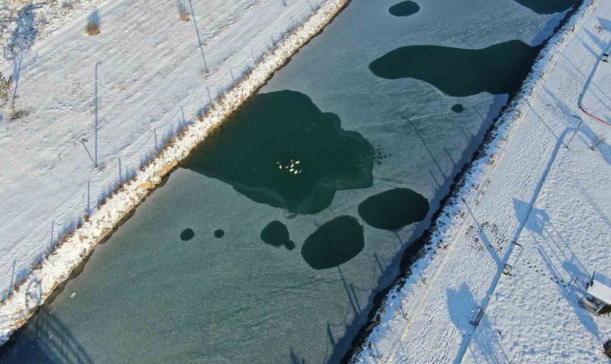 Sivas’ta Hasbahçe Göleti Kısmen Dondu — Ördekler Donmayan Kısımda Yüzüyor