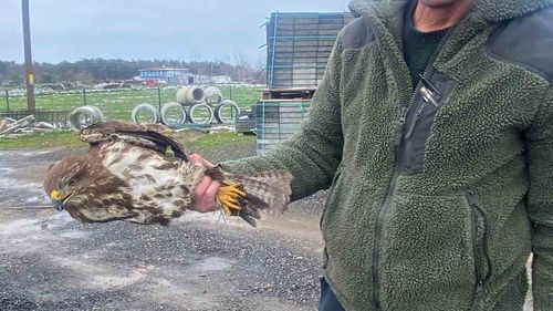 Tekirdağ Muratlı'da vatandaş Taner Tunçkol tarafından bulunan yaralı şahin, belediye bakım evinde ilk müdahalenin ardından Doğa Koruma ekiplerine teslim edildi.
