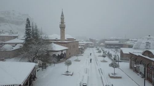 Tokat’ta yoğun kar yağışı kent merkezini beyaza bürüyerek ulaşımı aksattı; tarihi yapılar ve meydan dron ile görüntülendi. Karın aralıklı devam etmesi bekleniyor.