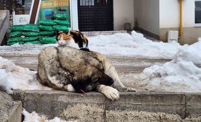 Sokakta uyuyan bir köpeğin sırtına çıkan kedi, soğuktan korunurcasına uzun süre burada bekledi. Köpeğin uyuduğu sırada kedinin sakinliği ve iki hayvan arasındaki sessiz uyum, çevredeki vatandaşların dikkatini çekti.