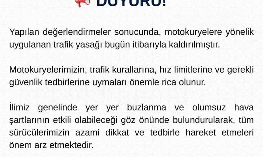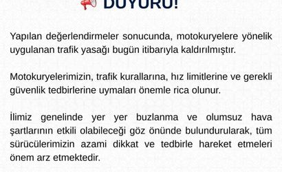 Açıklamada ayrıca, il genelinde yer yer buzlanma ve olumsuz hava şartlarının etkisini sürdürebileceğine dikkat çekildi. Bu kapsamda yalnızca motokuryelerin değil, tüm sürücülerin can ve mal güvenliği açısından azami dikkat ve tedbirle hareket etmeleri gerektiği ifade edildi.