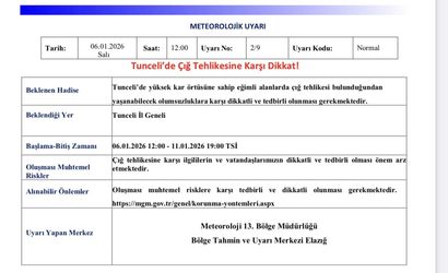 Meteoroloji 13. Bölge Müdürlüğü Tunceli için çığ uyarısında bulundu.