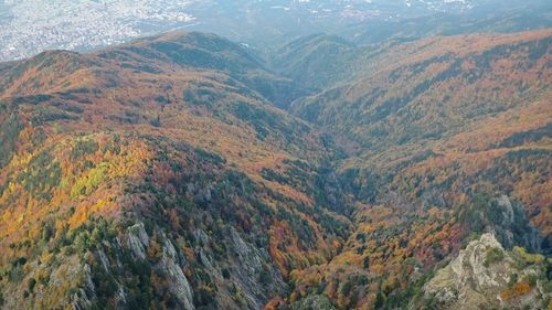 Uludağ ormanları, yeşilden sarıya, kahverengi ve kırmızının tonlarıyla sonbaharı yansıtıyor; Bakacak'tan yaklaşık 2 bin metreden Bursa izleniyor.