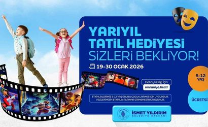 ÜMRANİYE BELEDİYESİ, 5-12 YAŞ ARASI ÇOCUKLAR İÇİN HAZIRLADIĞI KÜLTÜR VE SANAT DOLU ETKİNLİK PROGRAMIYLA YARIYIL TATİLİNE RENK KATMAYA HAZIRLANIYOR. 19-30 OCAK 2026 TARİHLERİ ARASINDA GERÇEKLEŞTİRİLECEK ETKİNLİKLERDE MİNİK MİSAFİRLER; FİLM GÖSTERİMLERİ, TİYATRO OYUNLARI VE ÇEŞİTLİ SÜRPRİZLERLE DOLU EĞLENCELİ BİR PROGRAMA KATILMA İMKÂNI BULACAK.