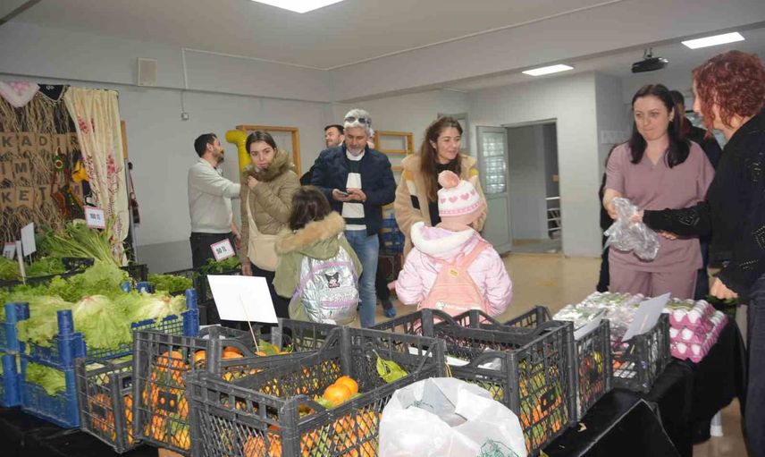 Pazarda taze sebze ve meyveler ile yöresel ürünler satışa sunuldu. Okul yönetimi, veliler ve esnafın katkısıyla kurulan stantlarda yumurta, roka, maydanoz, marul, elma, mandalina gibi ürünler sergilendi ve satışa çıktı.