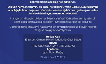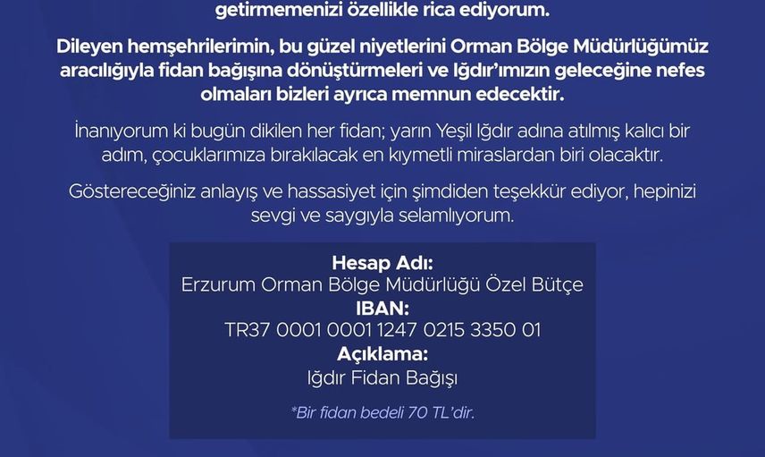 Taşolar'ın çağrısı, resmi tebriklerin çevresel ve kalıcı bir katkıya dönüştürülmesini hedefliyor. Yetkililer, bağışların Iğdır'ın yeşil alanlarının güçlendirilmesine katkı sağlayacağını belirtiyor.