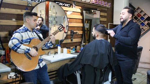Van'ın Erciş ilçesinde konservatuvar öğrencisi berber, müşterilerine canlı müzik eşliğinde tıraş imkanı sunuyor.