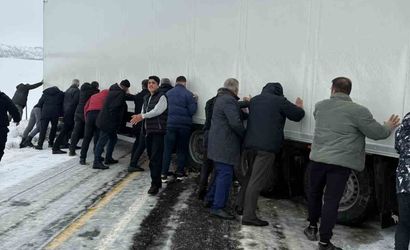 Muş'un Varto ilçesinde etkili olan kar yağışı sonrası kayganlaşan yolda kontrolden çıkan bir tır, kara yolu ulaşımını durma noktasına getirdi.