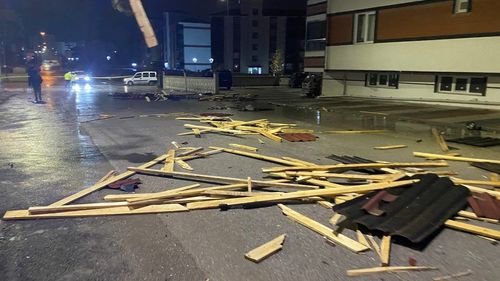 Yozgat'ın Sorgun ilçesi Osman Çavuş Mahallesi'nde fırtına 10 katlı binanın çatısını uçurdu; çatı 5 katlı binaya düştü, araçlarda maddi hasar, yaralı yok.