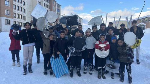 Yüksekova'da yaklaşık 50 çocuk, Cumhuriyet Mahallesi'ndeki yokuşu tepsi, bidon ve tahtalarla kayak pistine çevirdi.