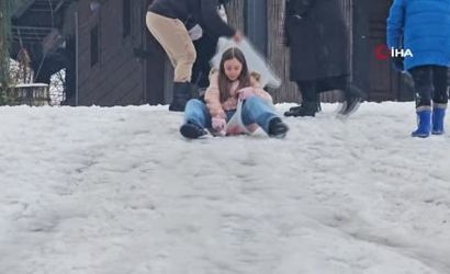 Zonguldak'ta çocuklar karda kayarak eğlendi
