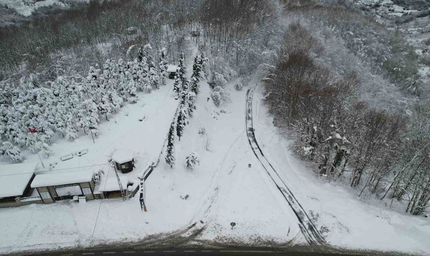 Temizlenen asfaltın siyah zemini ile ormanların üzerindeki beyaz örtü arasındaki kontrast, yol boyunca kartpostallık görüntüler oluşturdu. Güzergahın karla kaplı ağaçların arasından süzüldüğü anlar dron ile havadan kaydedildi.